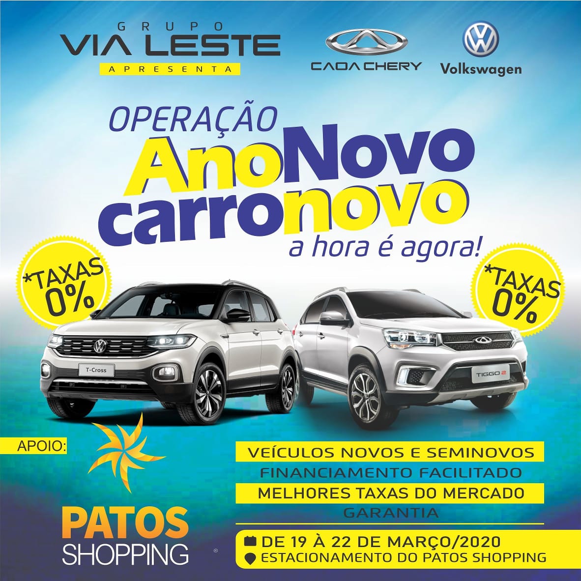 De 19 a 22 de março no Estacionamento do Patos Shopping.