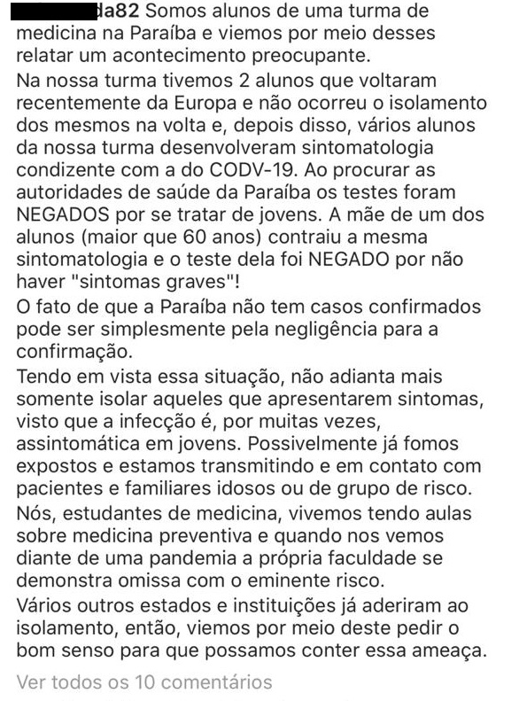 Um estudante de Medicina em João Pessoa fez um desabafo em rede social, onde relata que colegas viajaram ao exterior e voltaram à rotina da faculdade sem passar por isolamento. Doentes e com sintomas próximos do coronavírus, eles procuraram o serviço público de Saúde e os testes foram negados sob justificativa de que são jovens.