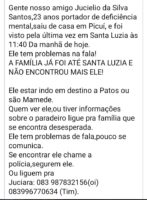 A família pede ajuda e diz quem o encontrar pode dar abrigo, pois ele não é agressivo, é amistoso com todo mundo. “Quem tiver qualquer informação ligue imediatamente para a gente, pode ser qualquer hora, que vamos imediatamente buscá-lo”, disse Ananda Vasconcelos, que é amiga da família.