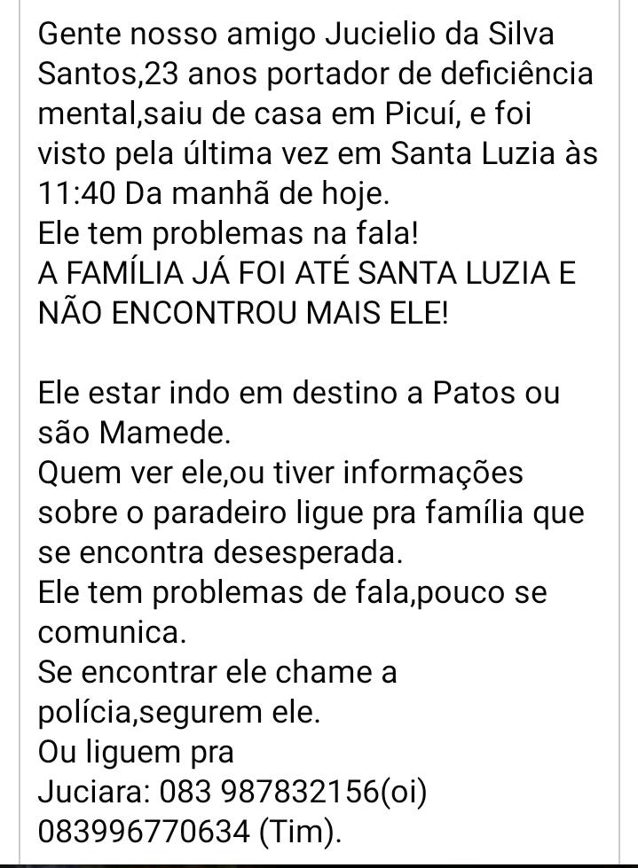 A família do jovem Juciélio da Silva Santos está desesperada à procura dele desde a manhã de ontem (domingo, 15), quando ele desapareceu de sua residência, em Picui.