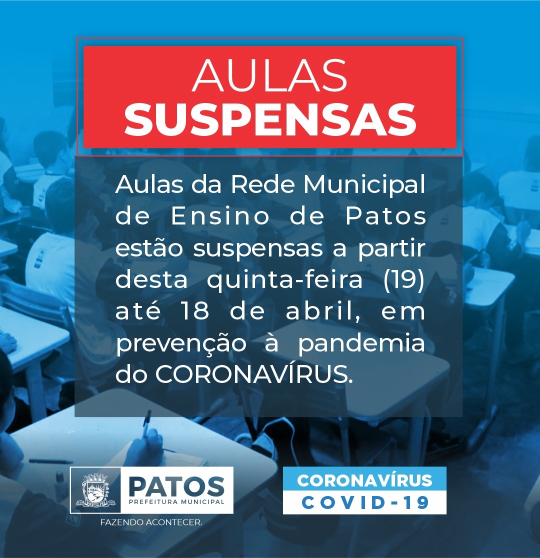 Sendo assim, a partir de 19 de março até 18 de abril de 2020, ficam suspensas as aulas presenciais regulares em todas as unidades da Rede Municipal de Ensino de Patos, podendo esse período ser prorrogado ou antecipado mediante o controle da situação.