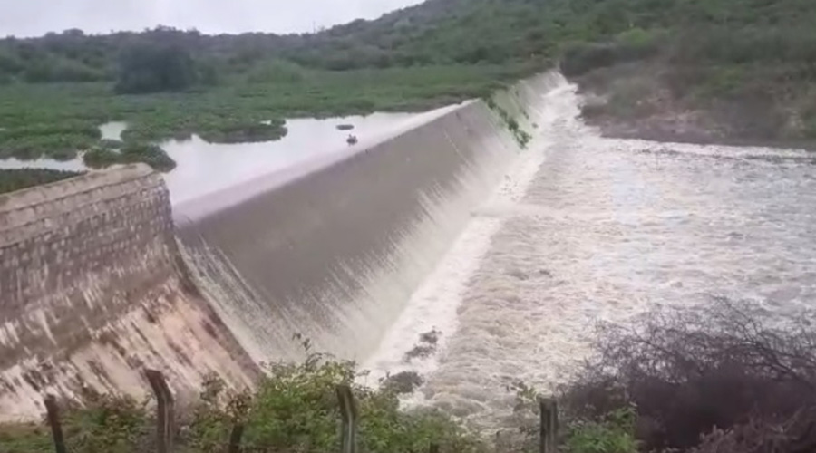 A Barragem Dinamarca, localizada em Serra Negra do Norte, e que tem capacidade para armazenar 3 milhões de metros cúbicos d’água, amanheceu transbordando nesta quinta-feira, 19, depois das boas chuvas caídas na região.