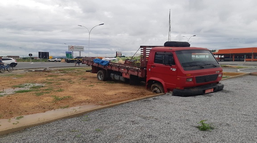 O motorista de um caminhão VW/8.120, com uma carga de hortifrutigranjeiro, perdeu o controle da direção e subiu o canteiro do giradouro da BR-230, em frente ao Atacadão em Patos.