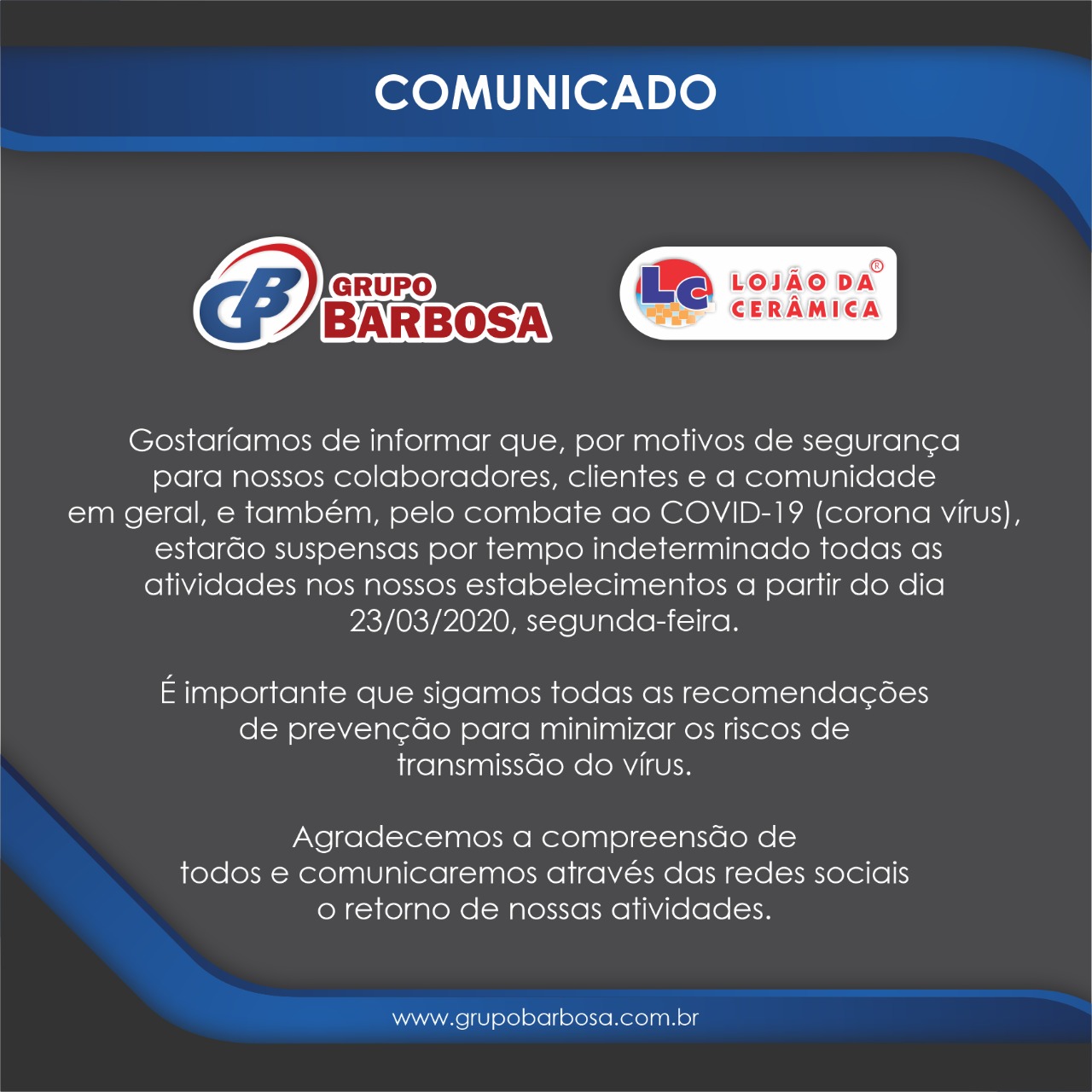 Gostaríamos de informar que, por motivos de segurança para nossos colaboradores, clientes e a comunidade em geral, e também, pelo combate ao COVID-19 (coronavírus), estarão suspensas por tempo indeterminado todas as atividades nos nossos estabelecimentos a partir do dia 23/03/2020, segunda-feira. Em Patos, o Grupo Barbosa está localizado às margens da Alça Sudeste