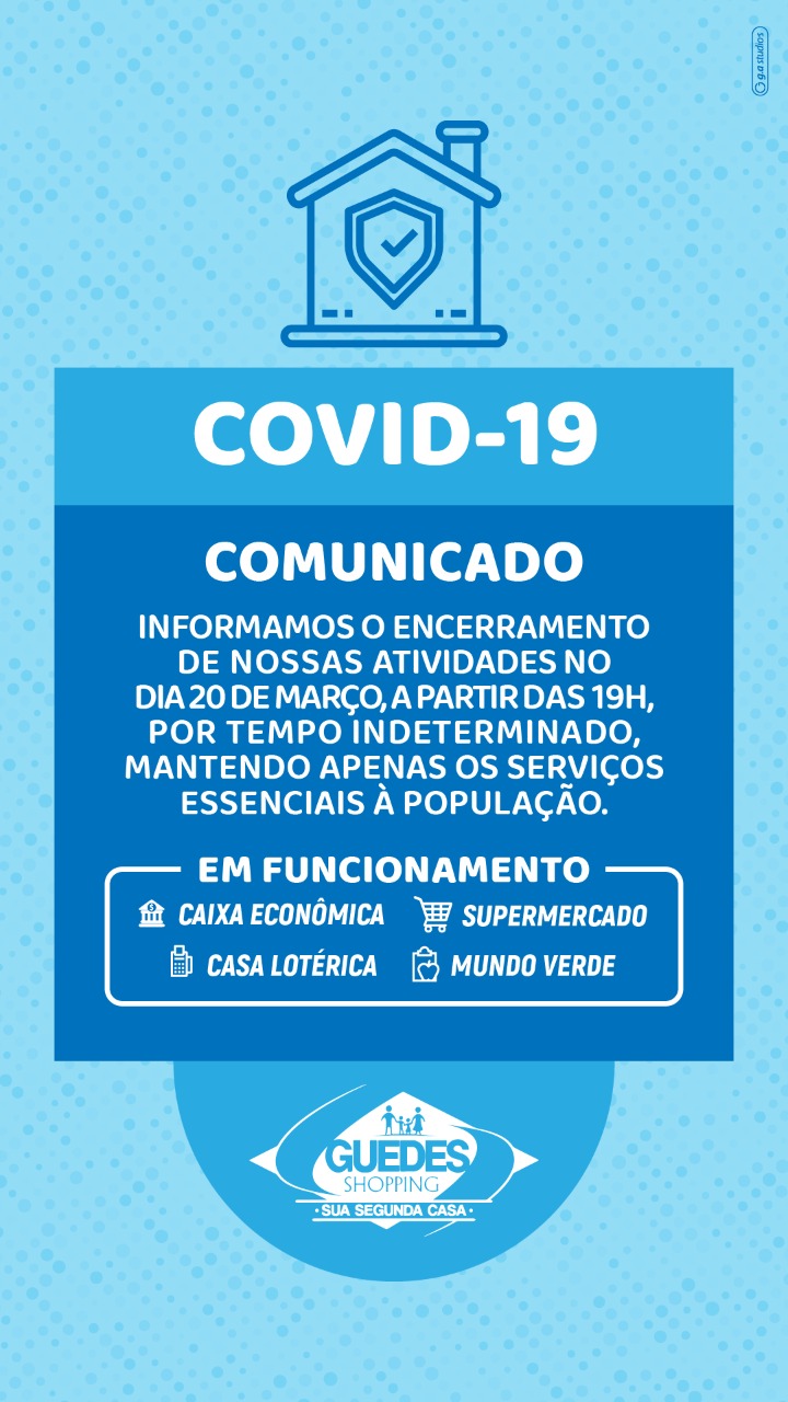 O Guedes Shopping já vinha adotando medidas de prevenção no nosso ambiente há alguns dias, porém, diante dos últimos acontecimentos referentes ao COVID-19, informamos o encerramento de nossas atividades por tempo indeterminado a partir das 19 horas de hoje (20/03/2020).