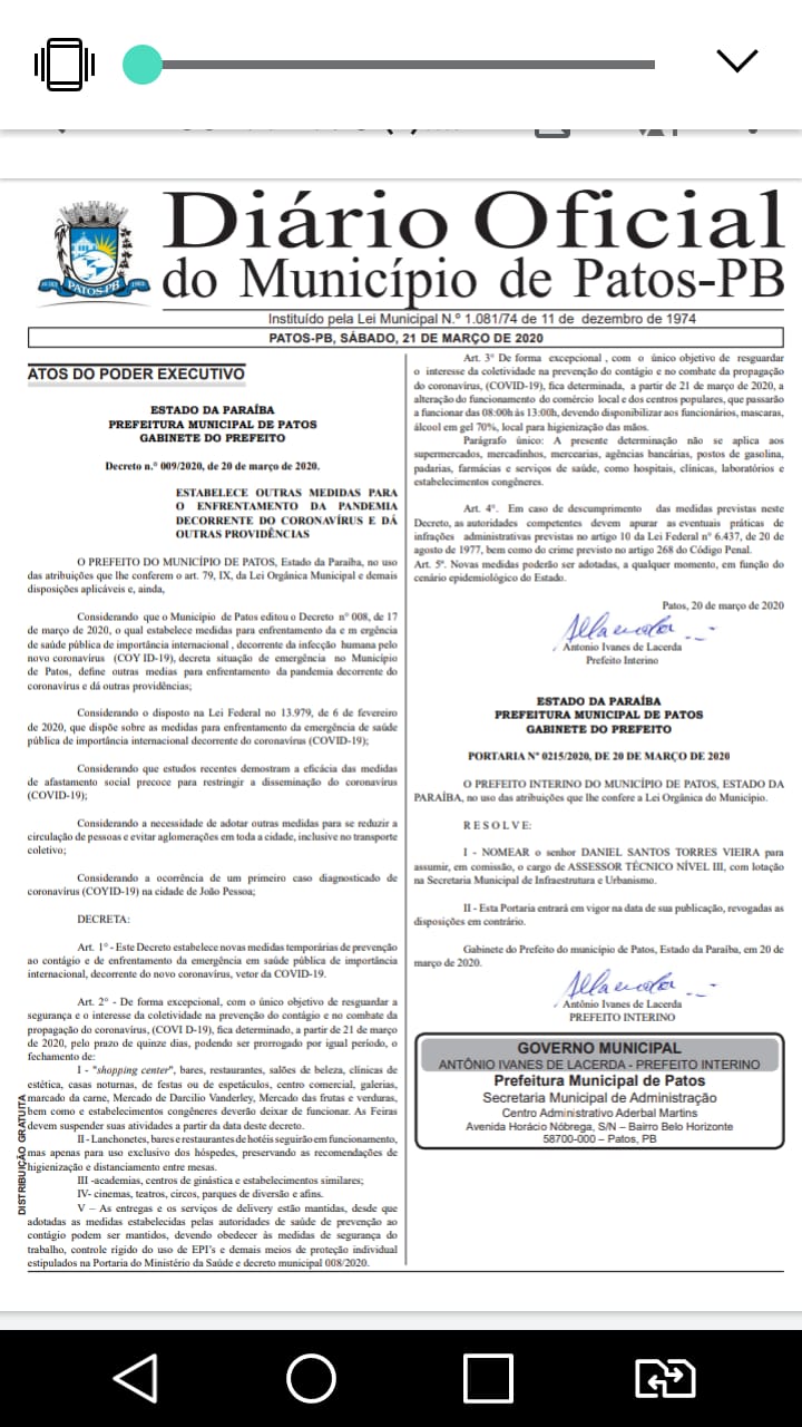 O Decreto determina a alteração do funcionamento do comércio local e dos centros populares, que passarão a funcionar das 08:00h às 13:00h, devendo disponibilizar aos funcionários, máscaras, álcool em gel 70%, local para higienização das mãos.