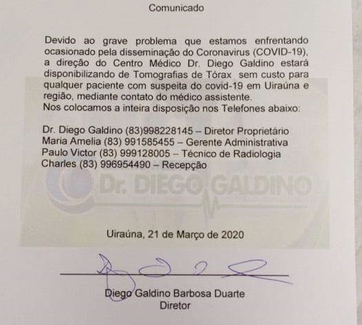 O combate ao coronavírus está estimulando diversas ações de solidariedade e união pelo país e pelo mundo. Em Uiraúna, na Região Metropolitana de Cajazeiras, o médico Diego Galdino postou um vídeo nas redes sociais informando que vai disponibilizar tomografias de tórax gratuitamente para qualquer paciente com suspeita de COVID-19 no município de Uiraúna e região.