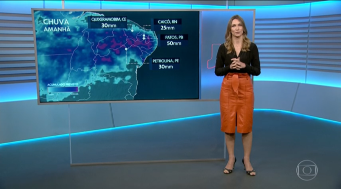 Na edição desta terça-feira, 24, do Jornal Nacional, exibido na Rede Globo, a garota do tempo Anne Lottermann anunciou a possibilidade de chuva em Patos. De acordo com a previsão, são esperados 50,0 mm para o município nesta quarta-feira, 25.
