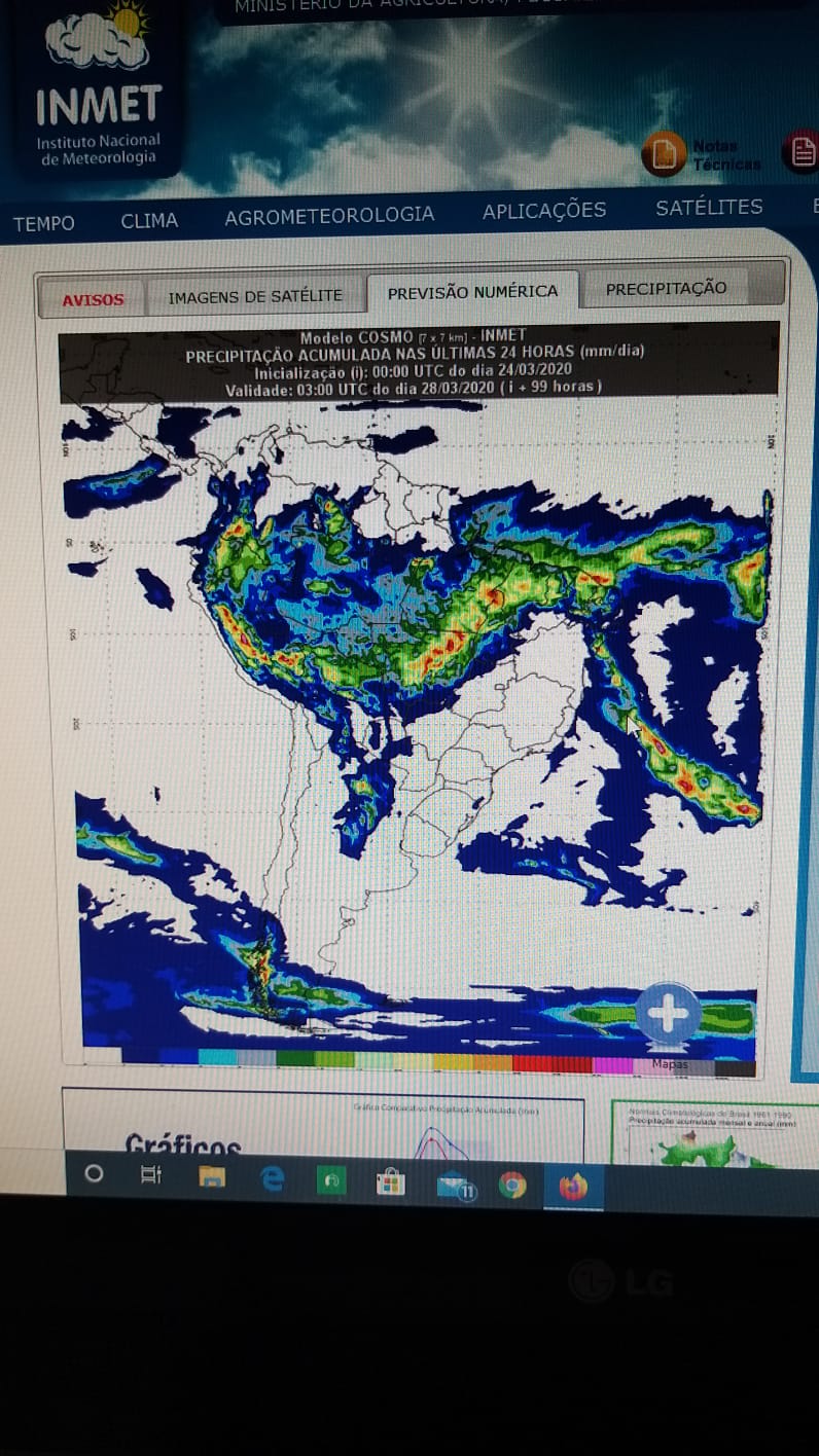 Em levantamento realizado nesta terça (24/03/20) às 6:00, o técnico da EMPAER Marconi Palmeira Filho verificou que os institutos nacionais Climatempo, Tempoagora e Inmet estão prevendo fortes chuvas entre hoje (terça, 24/03) e quinta-feira (26/03) em Patos e região.