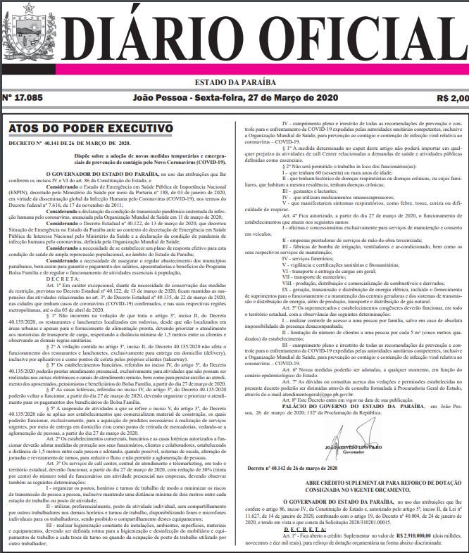 PALÁCIO DO GOVERNO DO ESTADO DA PARAÍBA, em João Pessoa, 26 de março de 2020; 132º da Proclamação da República.