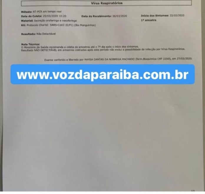 Na manhã desta sexta-feira, 27, o resultado foi divulgado e testou negativo. A causa morte atestara foi choque cardiogênico por causa indeterminada. O exame foi realizado e analisadas pelo LACEN – PB.