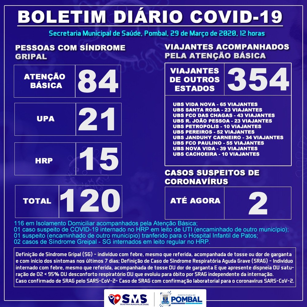 Em 24 horas o município de Pombal saltou de 111 para 120 casos de pessoas com síndromes gripais, além do registro de dois casos suspeitos para o Covid-19 (coronavírus).