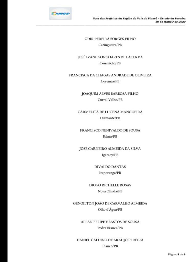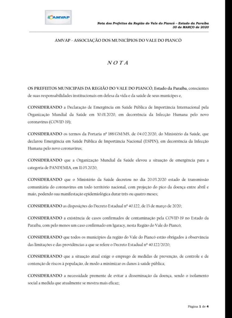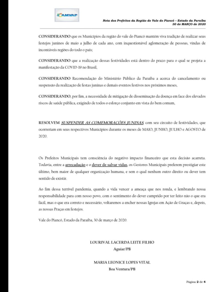 A Associação dos Municípios do Vale do Piancó (AMVP) divulgou uma nota no início da tarde desta segunda-feira (30), suspendendo todas as realizações das festividades juninas na região.