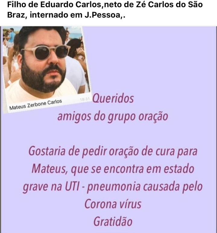 O publicitário Mateus Zerbone Carlos – filho do empresário Eduardo Carlos, presidente do sistema Paraíba de Comunicação, e neto de José Carlos, empresário da São Braz – faleceu na manhã desta segunda-feira (30) no hospital Clementino Fraga, com suspeita de covid-19.