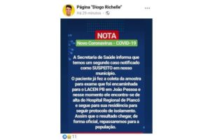 A cidade de Nova Olinda, localizada na região do Vale do Piancó, teve o segundo caso suspeito do novo coronavírus (Covid-19) divulgado pela Secretaria Municipal de Saúde na noite deste sábado (4). A informação foi publicada pela página oficial do prefeito Diogo Rosas no Facebook.