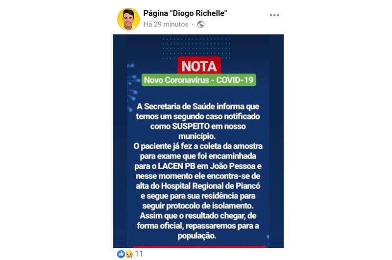 De acordo com a publicação, o paciente que apresentou os sintomas da doença teve coleta da amostra de exame encaminhada ao LACEN-PB, em João Pessoa, para a realização da análise. Ele encontra-se de alta do Hospital Regional de Piancó, onde estava, e segue para sua residência para seguir o protocolo de isolamento.