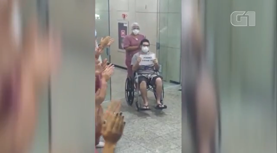 Um paciente de 31 anos que foi curado de Covid-19 homenageou os funcionários do Hospital Igesp, na Bela Vista, região central de São Paulo, ao receber alta na tarde deste sábado (4). Em vídeo que circula nas redes sociais, o paciente entra em uma sala empurrado em uma cadeira de rodas e um cartaz onde se lê “Venci a Covid-19”.