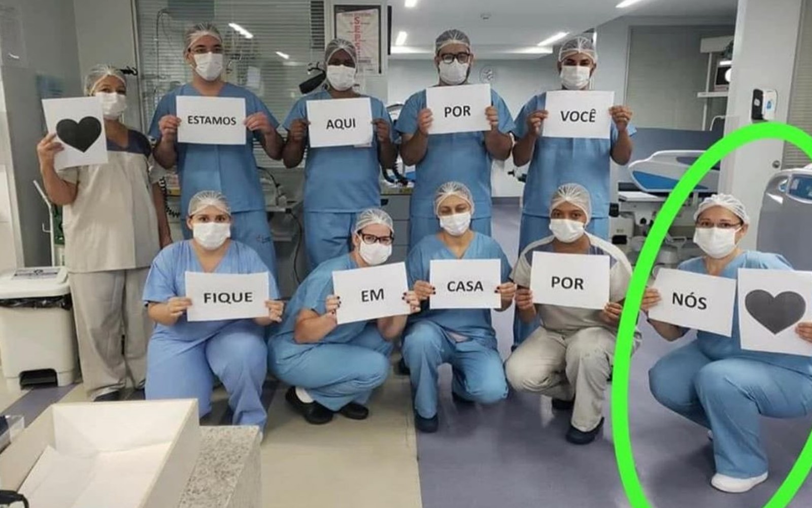 Adelita aparece em uma foto ao lado de colegas de trabalho segurando folhas de papel com a frase: “Estamos aqui por você, fique em casa por nós”.