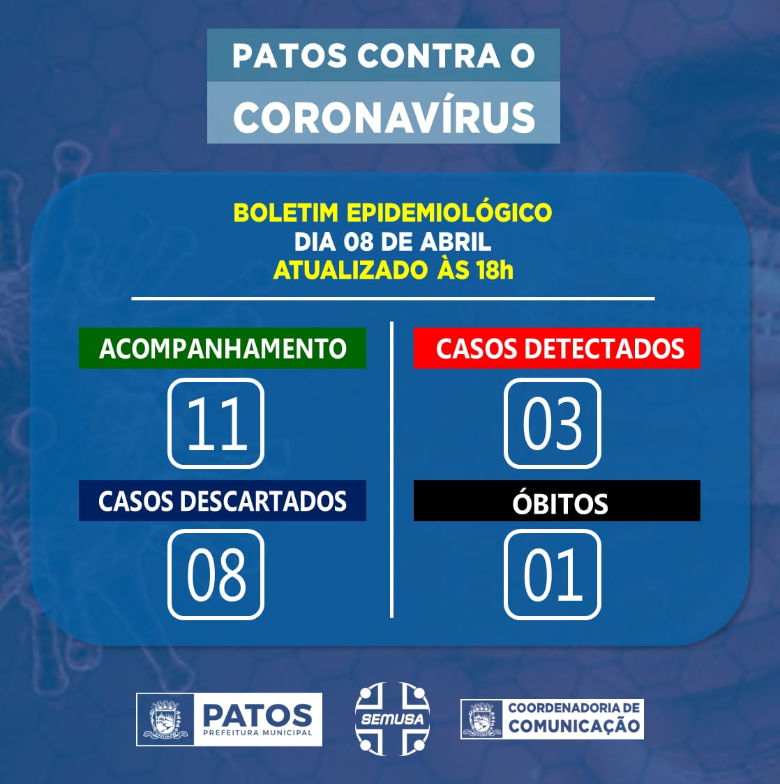 Nesta quarta-feira, 08, a Prefeitura de Patos, através da Secretaria de Saúde e da Vigilância Epidemiológica, emitiu mais um boletim epidemiológico a respeito dos números do coronavírus na cidade.