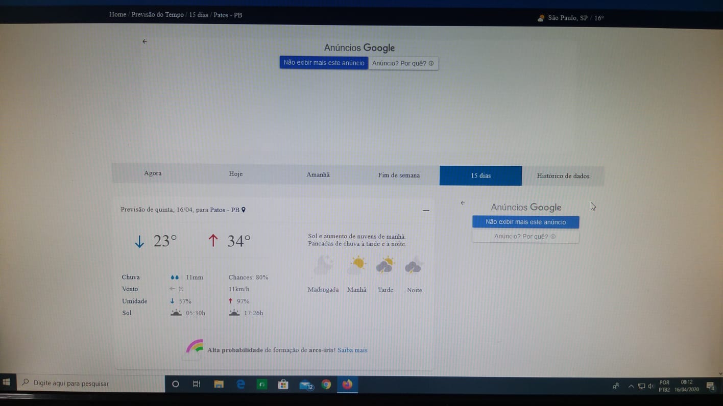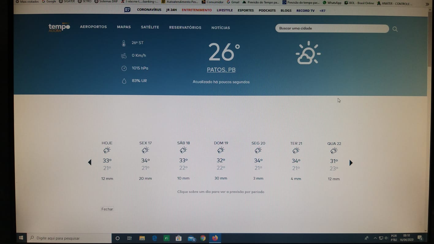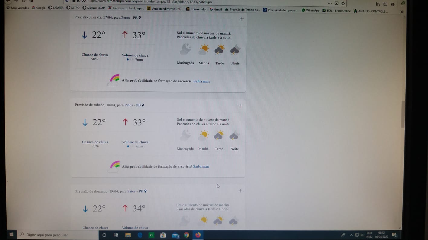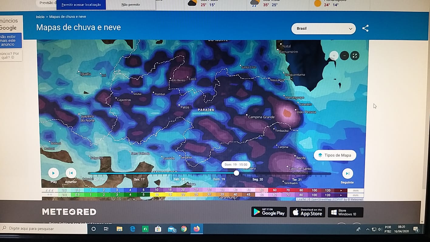 De acordo com o levantamento feito pelo técnico da EMPAER Marconi Palmeira Filho nesta quinta-feira (16/04/20) às 8:10 da manhã, os principais institutos de meteorologia (Climatempo, Tempo agora, Inmet e Meteored) estão prevendo chuvas entre hoje quinta-feira (16/04/20) e domingo (19/04/20).