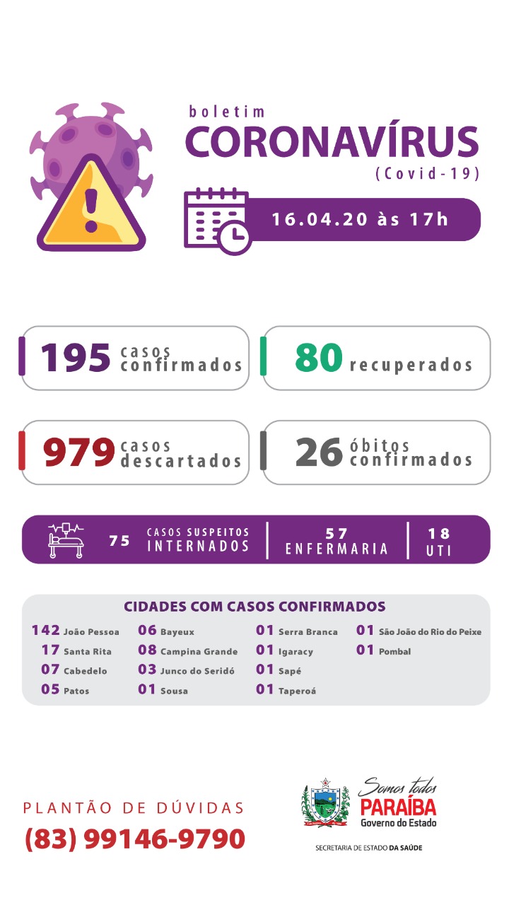 Veja abaixo o boletim divulgado nesta quinta-fera, 16, pela Secretaria Estadual de Saúde, com os novos números do coronavírus na Paraíba. Clique na imagem para ampliá-la: