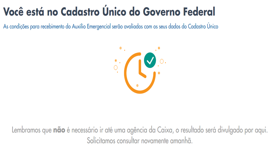 Mas, além da Covid-19, temos outro problema. Como se manter durante a quarentena? Então! Eis que uma pequena luz se acende. Só que, ao que parece, esse auxílio ainda não chegou a milhões de famílias. Pais de família e donas de casa, trabalhadores informais e desempregados que todos os dias acessam o sistema e se deparam com uma mensagem avisando: Você está no Cadastro Único do Governo Federal. As condições para recebimento do Auxílio Emergencial serão avaliados com os seus dados do Cadastro Único. Lembramos que não é necessário ir até uma agência da Caixa, o resultado será divulgado por aqui. Solicitamos consultar novamente amanhã.