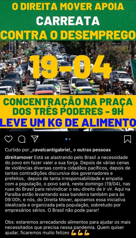 No panfleto que circula nas redes sociais, o grupo convoca com os seguintes argumentos: “Está se alastrando pelo Brasil a necessidade do povo em fazer valer a sua força. Depois de várias cenas de violências diversas contra cidadãos pacíficos, depois de tantas contradições discursiva dos governadores e prefeitos, depois de tanta irresponsabilidade e empatia com a população, o povo sairá, neste domingo (19/04), nas ruas do Brasil para reivindicar o seu direito de ir vir”, diz a convocação.