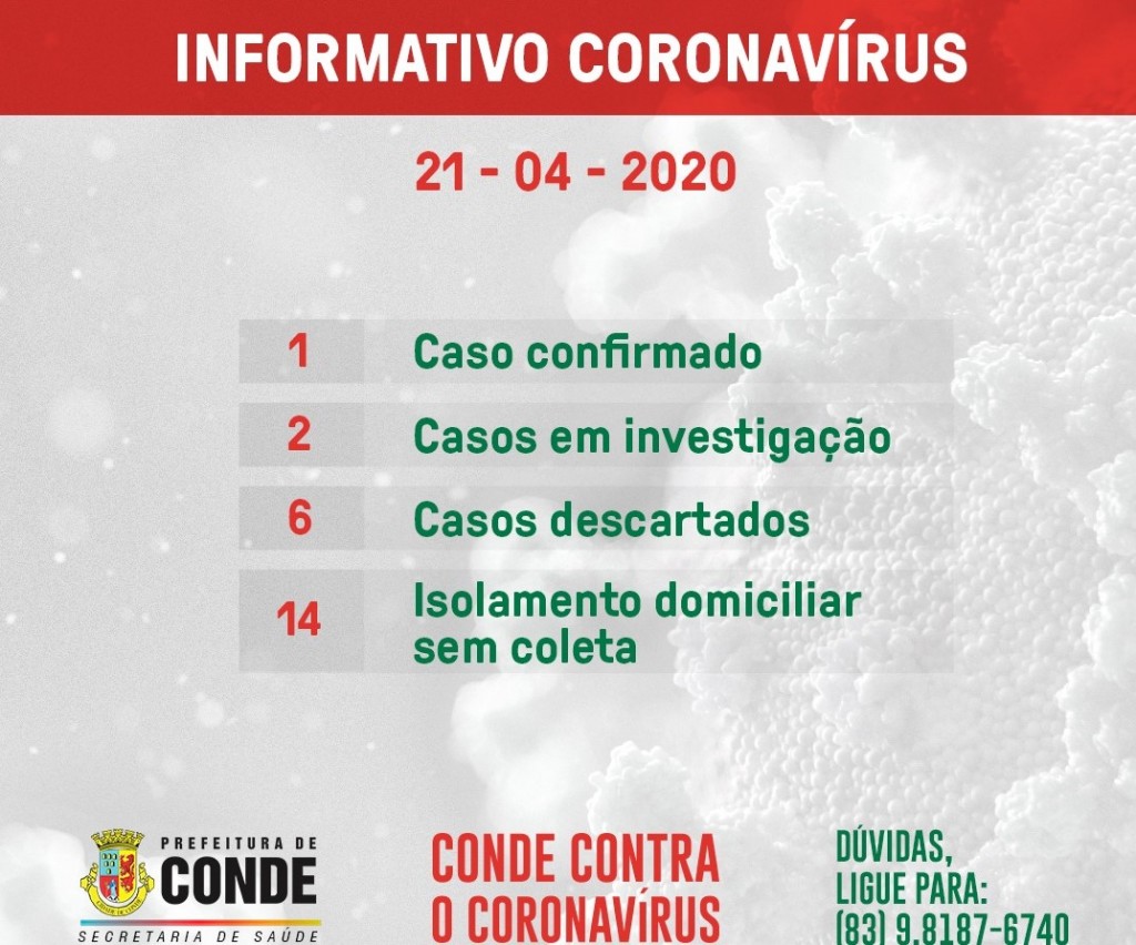 A Secretaria de Saúde de Conde recebeu na noite desta terça-feira, (21/04), o exame que confirma o primeiro caso de Covid-19 no município. Trata-se de um homem de 18 anos, residente no bairro da Cidade das Crianças, que apresentou sintomas como febre, dor de garganta, diarreia, vômito, sudorese e tosse, após regressar de viagens a trabalho.