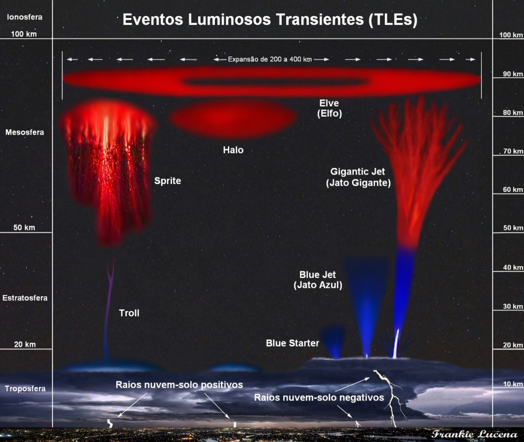 Ele explica que os TLEs são associados a descargas atmosféricas comuns, também conhecidas como raios, dentro das tempestades. Os TLEs mais comuns são os sprites, que também já foram registrados na Paraíba algumas vezes. Existem também outros TLEs, como elfos, halos, trolls, blue starters e jatos azuis.