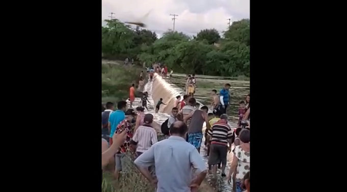 Por volta das 15 horas desta quinta-feira, 23/04, quando o Açude do Jatobá começou a transbordar, o que não acontecia há 11 anos, muita gente estava no sangradouro do manancial aguardando com expectativa para registrar o momento.