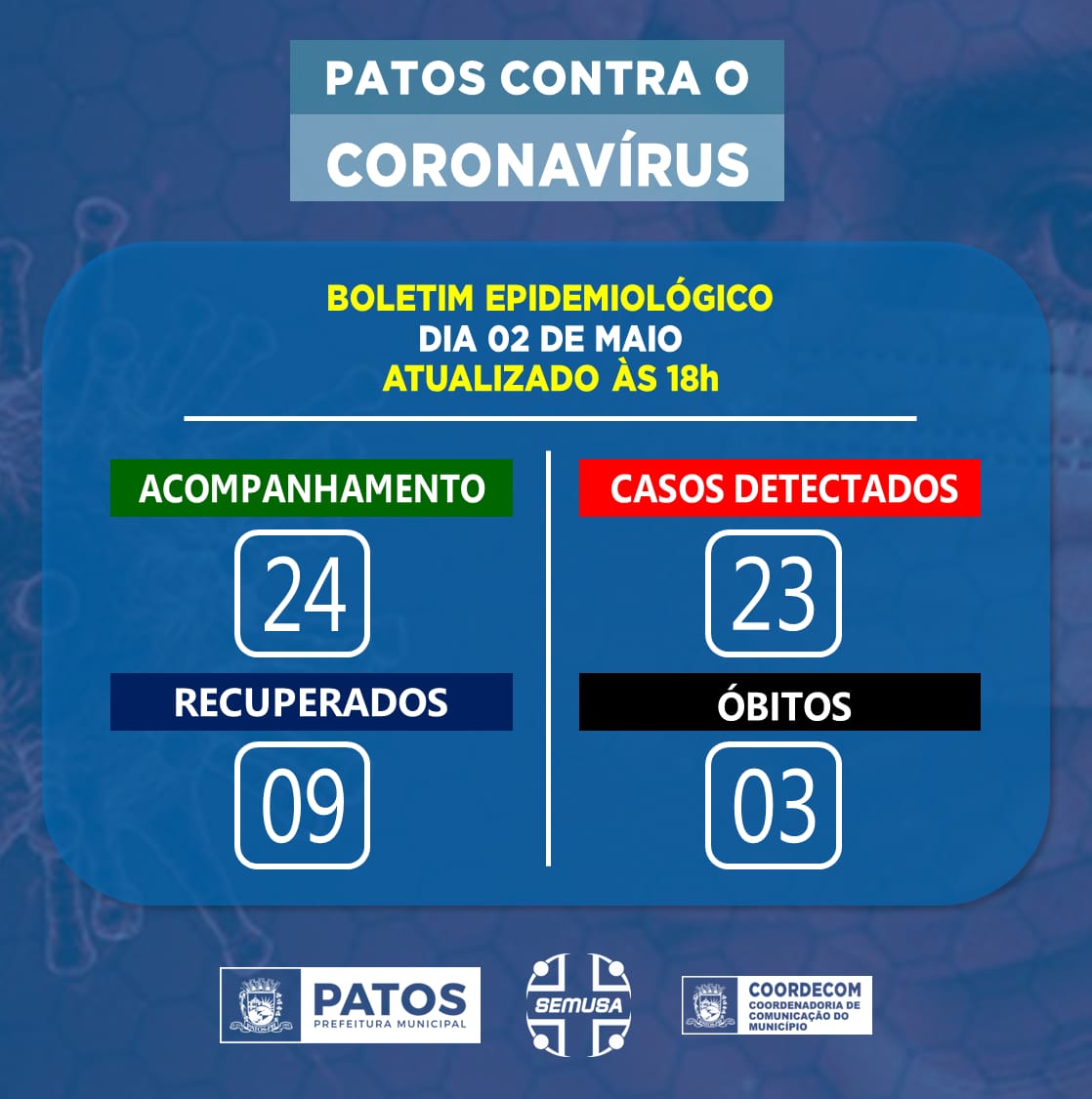 A Secretaria Estadual de Saúde informou na tarde desta sábado, 02/05, que já são 23 casos confirmados de coronavírus em Patos. A informação foi confirmada pela Vigilância Epidemiológica da Secretaria Municipal de Saúde.