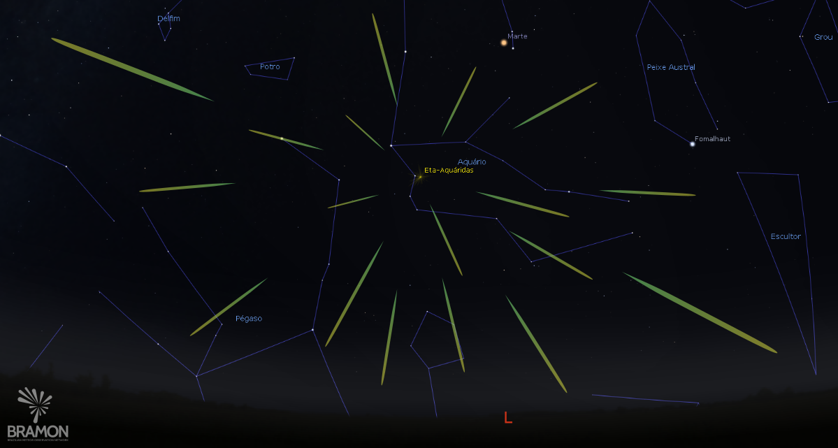 Apesar do radiante da Eta Aquáridas ficar em Aquário, você não precisa estar olhando na direção dessa Constelação para ver seus meteoros, pois eles aparecerão em todas as partes do céu, apenas parecendo vir da direção da Constelação, conforme mostrado na imagem abaixo.