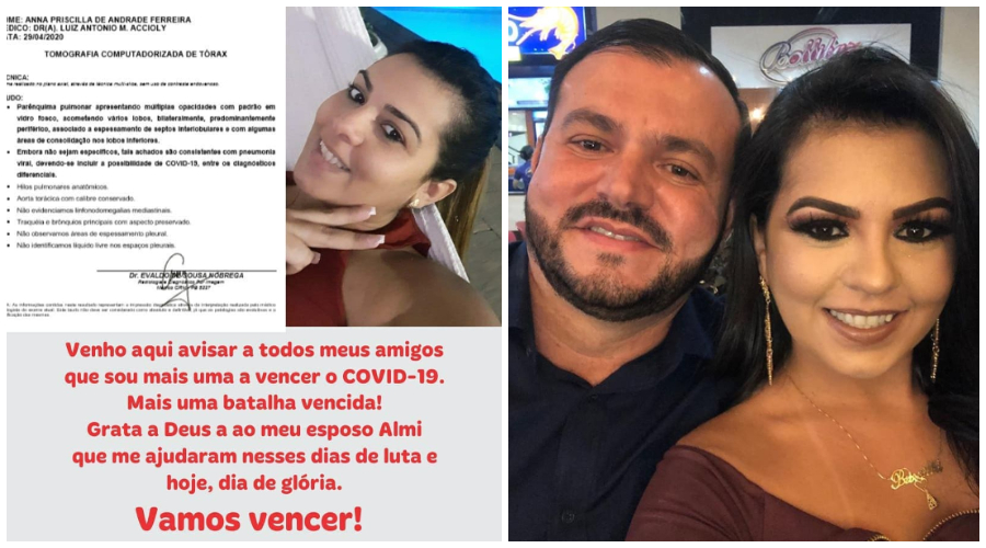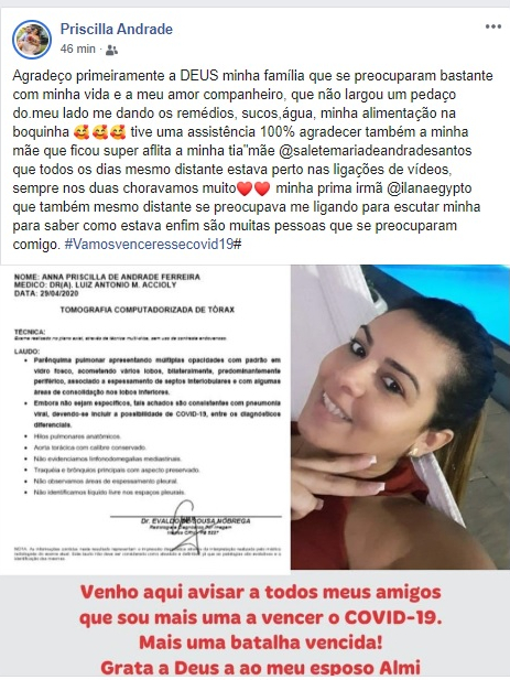 “Agradeço primeiramente a DEUS minha família que se preocuparam bastante com minha vida e a meu amor companheiro, que não largou um pedaço do.meu lado me dando os remédios, sucos,água, minha alimentação na boquinha. Tive uma assistência 100% agradecer também a minha mãe que ficou super aflita a minha tia”mãe @saletemariadeandradesantos que todos os dias mesmo distante estava perto nas ligações de vídeos, sempre nos duas choravamos muito?? minha prima irmã @ilanaegypto que também mesmo distante se preocupava me ligando para escutar minha para saber como estava enfim são muitas pessoas que se preocuparam comigo. #Vamosvenceressecovid19#”
