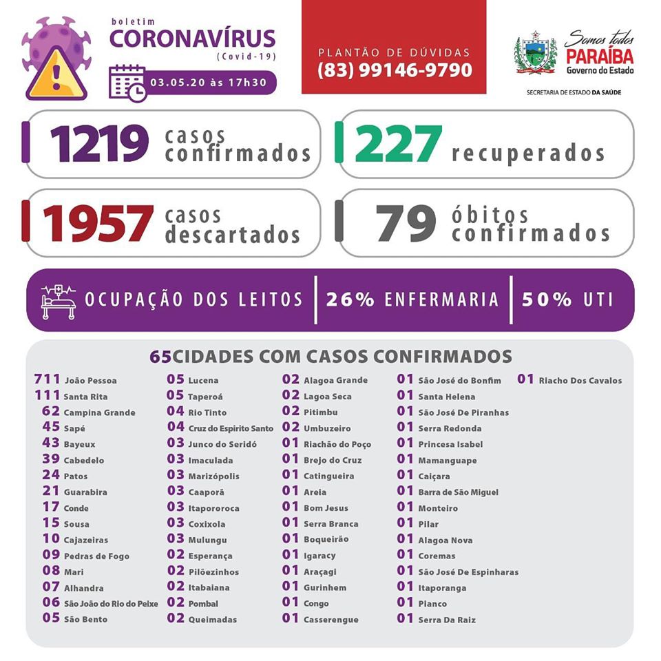 Neste domingo, 03 de maio, a Paraíba atingiu 1219 casos de Covid -19. Destes, 79, infelizmente, faleceram e 277 já se recuperaram, segundo informações das Secretarias Municipais de Saúde. Outros 1957 casos investigados já foram descartados para Covid-19. Dos 370 leitos de UTI previstos no plano de Contingência para Coronavírus, 171 já estão ativos, 50% deles ocupados.
