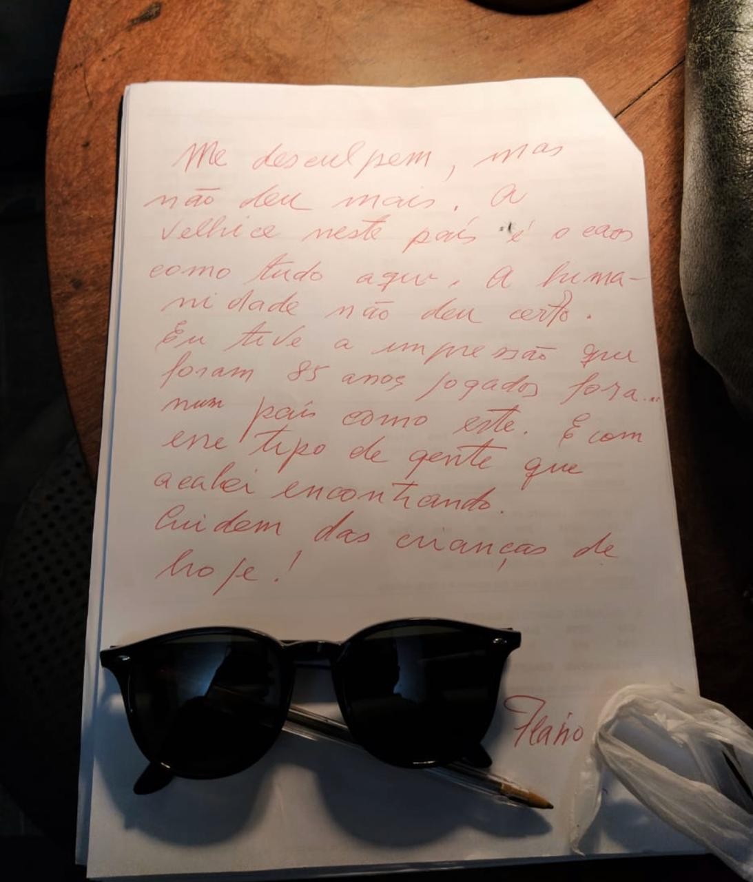 Na carta (veja imagem abaixo), Flávio revela uma decepção com o Brasil e com o ‘tipo de gente’ que acabou encontrando. “Me desculpem, mas não deu mais. A velhice neste país é o caos como tudo aqui. A humanidade não deu certo. Eu tive a impressão que foram 85 anos jogados fora num país como este. E com esse tipo de gente que acabei encontrando. Cuidem das crianças de hoje.”