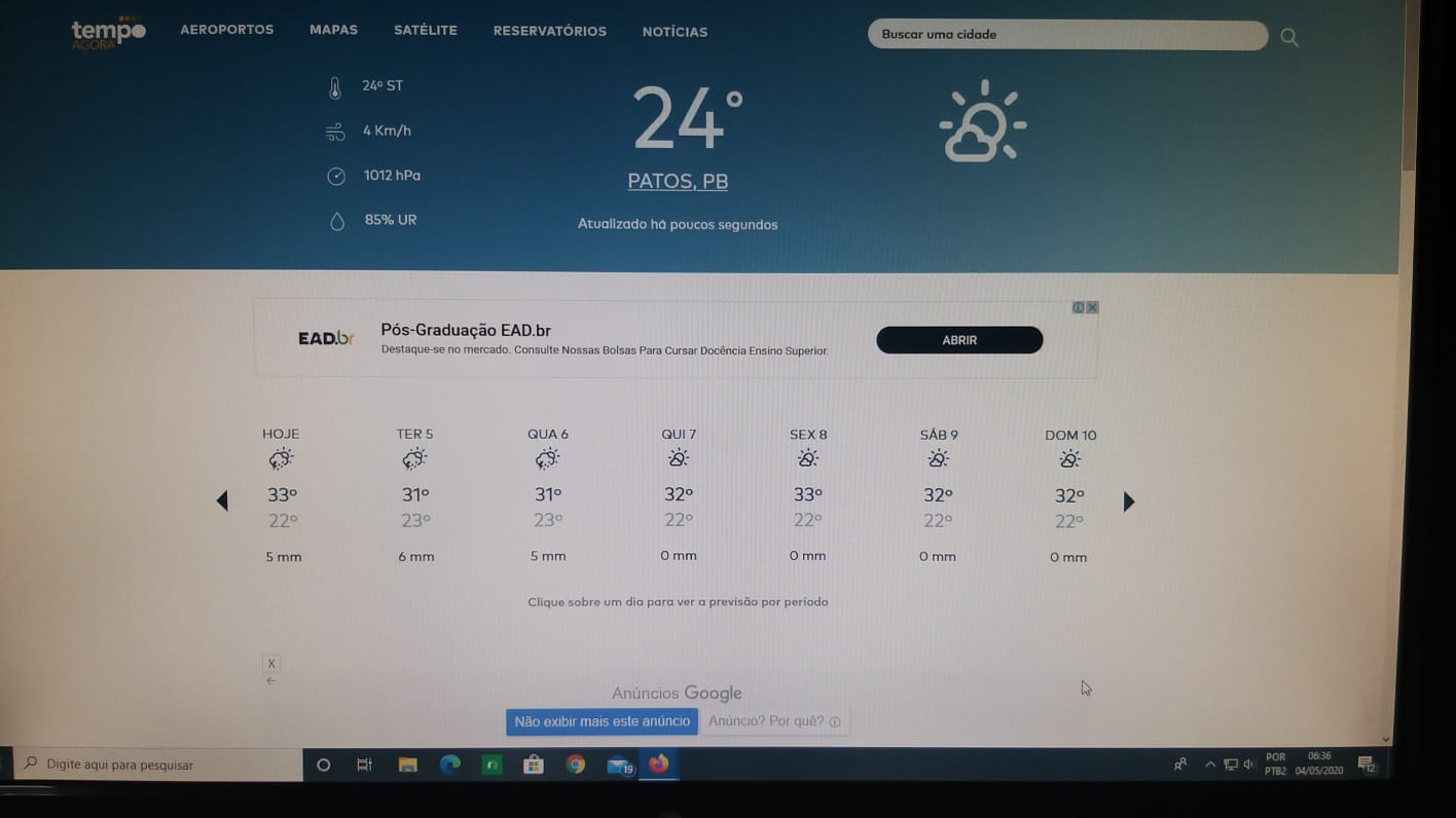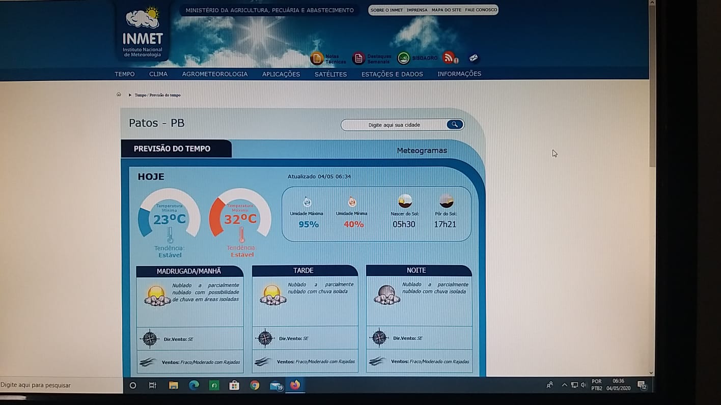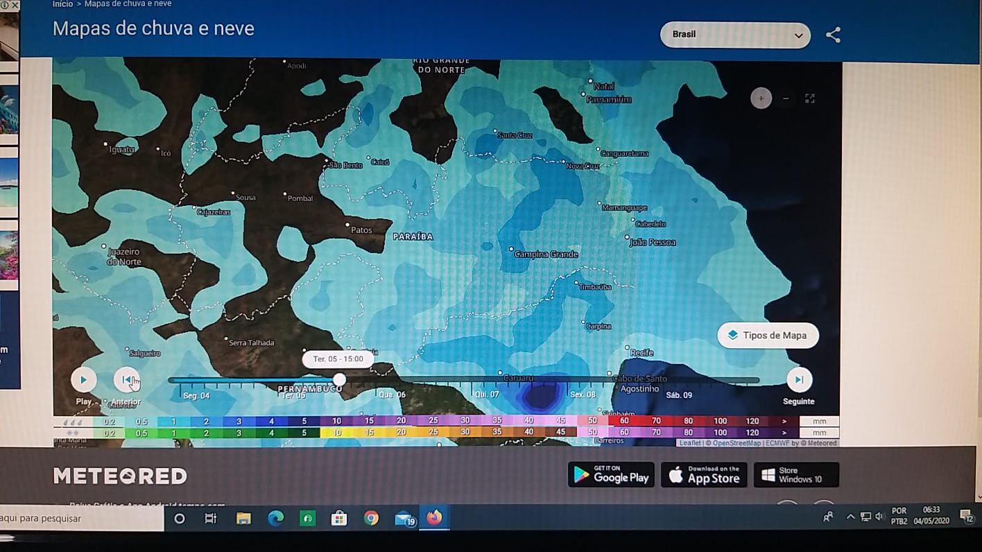 Em novo levantamento feito nos principais institutos de meteorologia (Climatempo, Tempo agora, Inmet e Meteored) pelo técnico da EMPAER Marconi Palmeira Filho às 06:33 desta segunda-feira(04/05/20), verificou-se que alguns institutos divulgaram possibilidades de ocorrências de novas chuvas na região polarizada por Patos entre hoje (segunda-feira 04/05/20)a partir das 12:00hs até amanhã (terça-feira 05/04/20) às 18:00 horas.