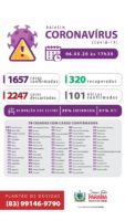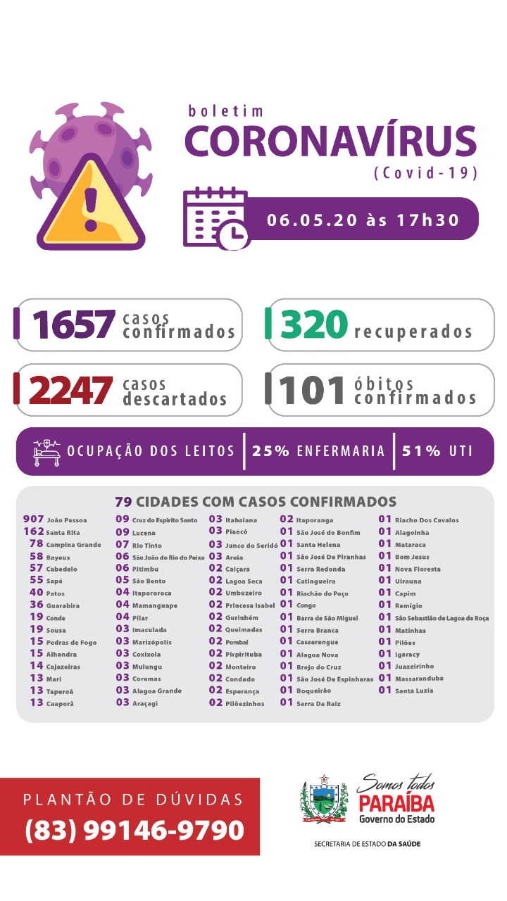 Nesta quarta, 06 de maio, a Paraíba notificou 164 novos casos de Covid-19 e superou os 100 óbitos causados pela doença. Assim, a Paraíba atinge 1.657 casos de Covid -19. Destes, 101, infelizmente, faleceram e 320 já se recuperaram, segundo informações das Secretarias Municipais de Saúde. Outros 2.247 casos investigados já foram descartados para Covid-19. Dos 370 leitos de UTI previstos no plano de Contingência para Coronavírus, 197 já estão ativos, 51% deles ocupados.