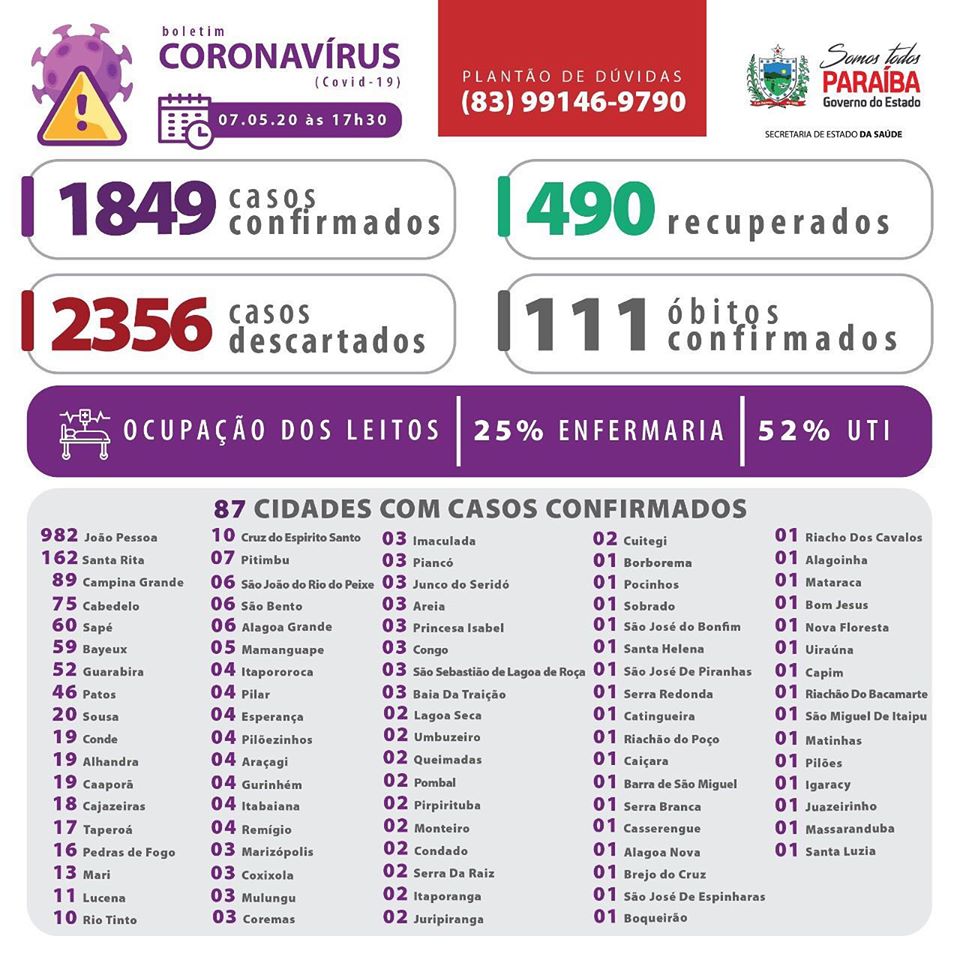 Nesta quinta, 07 de maio, a Paraíba tem 42,8% de índice de isolamento social, quando o recomendado é 70%. São 192 novos casos de Covid-19 e 10 óbitos causados pela doença nas últimas 24 horas. Assim, a Paraíba atinge 1.849 casos de Covid -19. Destes, 111, infelizmente, faleceram e 420 já se recuperaram, segundo informações das Secretarias Municipais de Saúde. Outros 2.356 casos investigados já foram descartados para Covid-19. Dos leitos de UTI ativados na Região Metropolitana de João Pessoa, 78% estão ocupados.