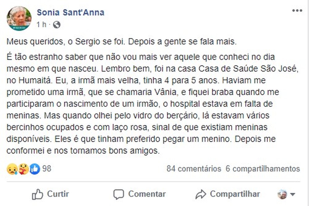Na véspera, Sonia havia publicado, na mesma rede social, que o irmão apresentava sinais de melhora clínica. Ele estava internado desde o dia 3 de maio com sintomas da Covid-19, conforme havia sido informado pelo Jornal O Globo.