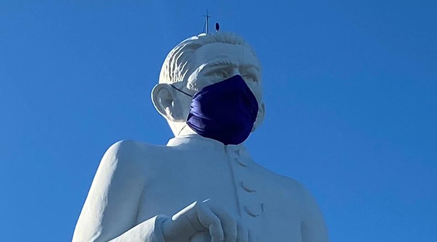Pela primeira vez em meio século de história, a estátua do Padre Cícero, cartão-postal de Juazeiro do Norte, no Sul do Ceará, ganhou um novo adereço: uma máscara facial. Símbolo do combate à pandemia da Covid-19, o item de 2,8 por 2,4 metros foi colocado na tarde deste sábado (09), em uma tentativa de conscientizar a população sobre a adoção de medidas de proteção e higiene, que diminuem as chances de contaminação pelo novo coronavírus.