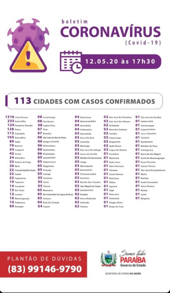 Nesta terça, 12 de maio, a Paraíba registra o maior número de casos e óbitos em um único dia, são 252 novos casos de Covid-19 e 15 óbitos causados pela doença. Assim, a Paraíba atinge 2.777 casos de Covid -19.