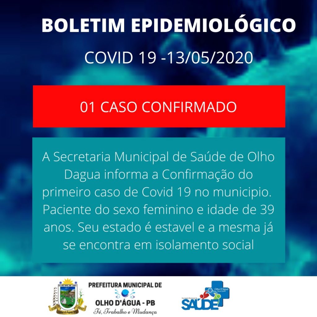 A Secretaria Municipal de Saúde de Olho d’Água, no Vale do Piancó, informa a confirmação do primeiro caso de Covid-19 no município.