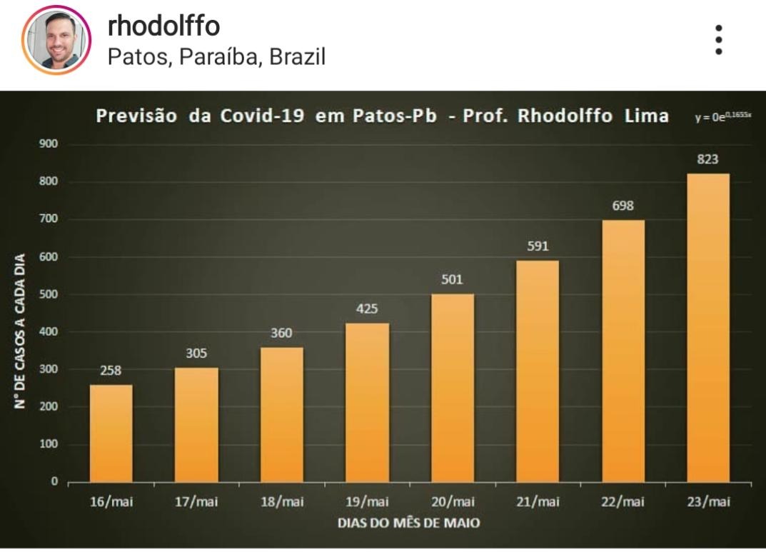 Em uma de suas análises, Rhodolffo projetou que Patos poderá chegar neste sábado (16) a 258 casos. Nesta sexta-feira (15), foram confirmados 219, um aumento de 45 infectados em relação a quinta-feira, um verdadeiro recorde.
