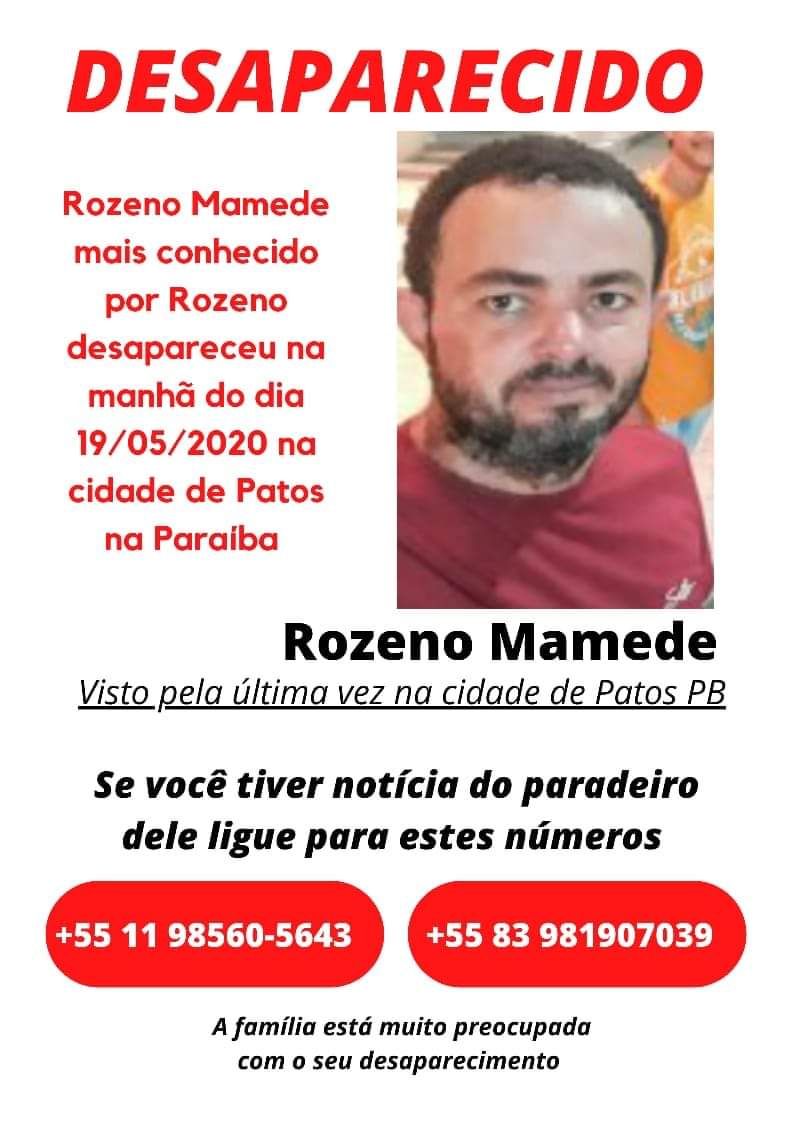 Um homem de nome Rozeno Mamede está sem dar notícias à família desde a manhã de ontem (terça, 19/05). Ele saiu de sua residência, no centro de Patos, e não se comunicou mais.