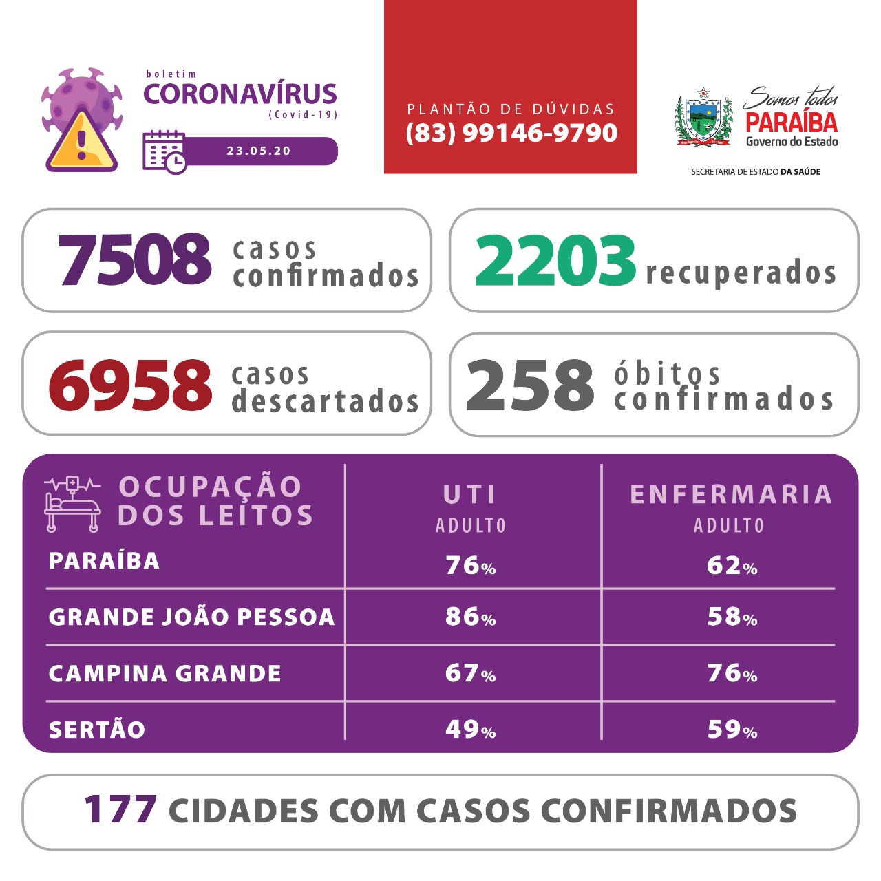 Neste sábado, 23 de maio, a Paraíba registra 626 novos casos de Covid-19 e 10 óbitos confirmados desde a ultima atualização. São 7.508 paraibanos que já contraíram a doença, 2.203 pessoas que já se recuperaram e 258, infelizmente, faleceram.