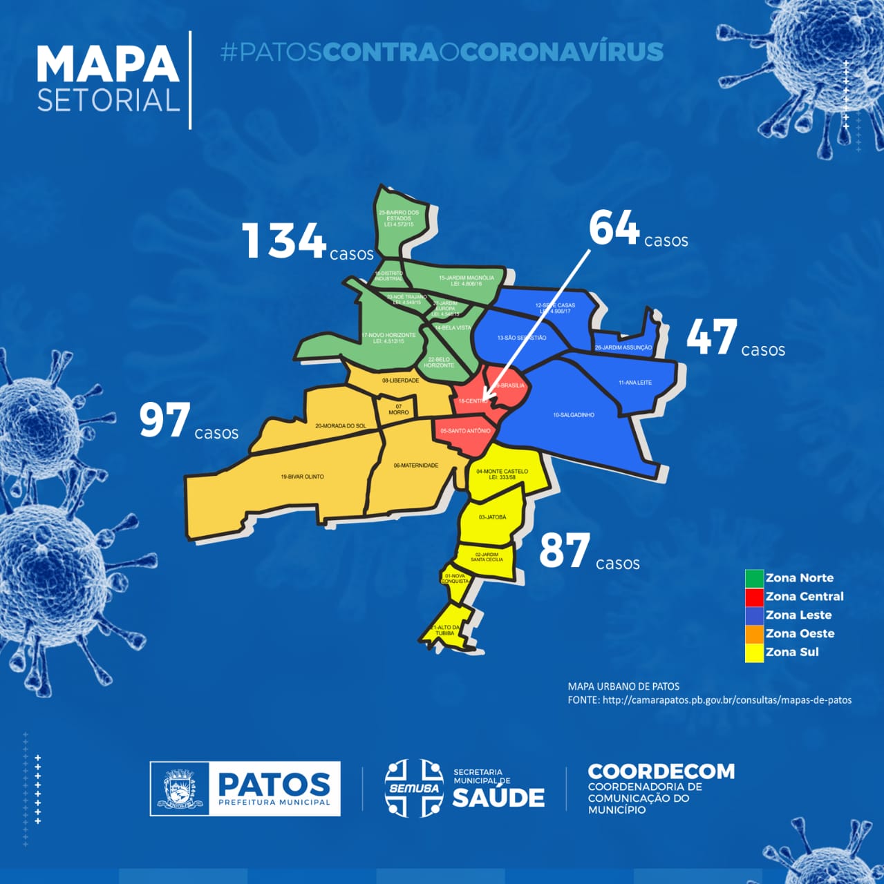 De acordo com os números de hoje, a região com o maior índice de casos confirmados para o Covid-19 em Patos é a Zona Norte, com 134 casos. Na separação por bairros, o Jatobá lidera com o registro de 61 casos. Confira a relação completa dos bairros na 3ª imagem.