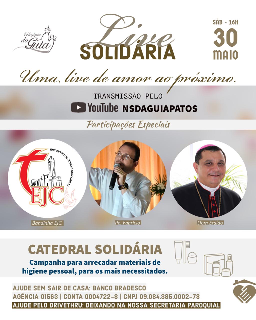 No próximo sábado, 30 de maio, às 16h, direto da nossa Igreja Catedral, em Patos, louvor, oração e solidariedade. Ao vivo no nosso canal do YouTube: NSdaGuiaPatos.