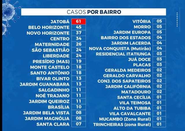 A maior incidência continua sendo o Jatobá, com 61 casos, no boletim anterior eram 53, seguido do Belo Horizonte com 45, Novo Horizonte com 37 infectados, e Centro com 34 casos.