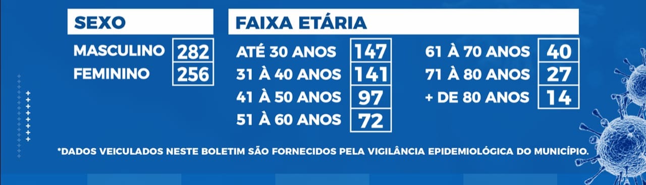 Agora são 282 homens com a Covid-19 (52,41%) contra 256 mulheres (47,59%), uma diminuição para apenas 26 casos. No dia 25, essa diferença era de 47 casos entre os sexos.