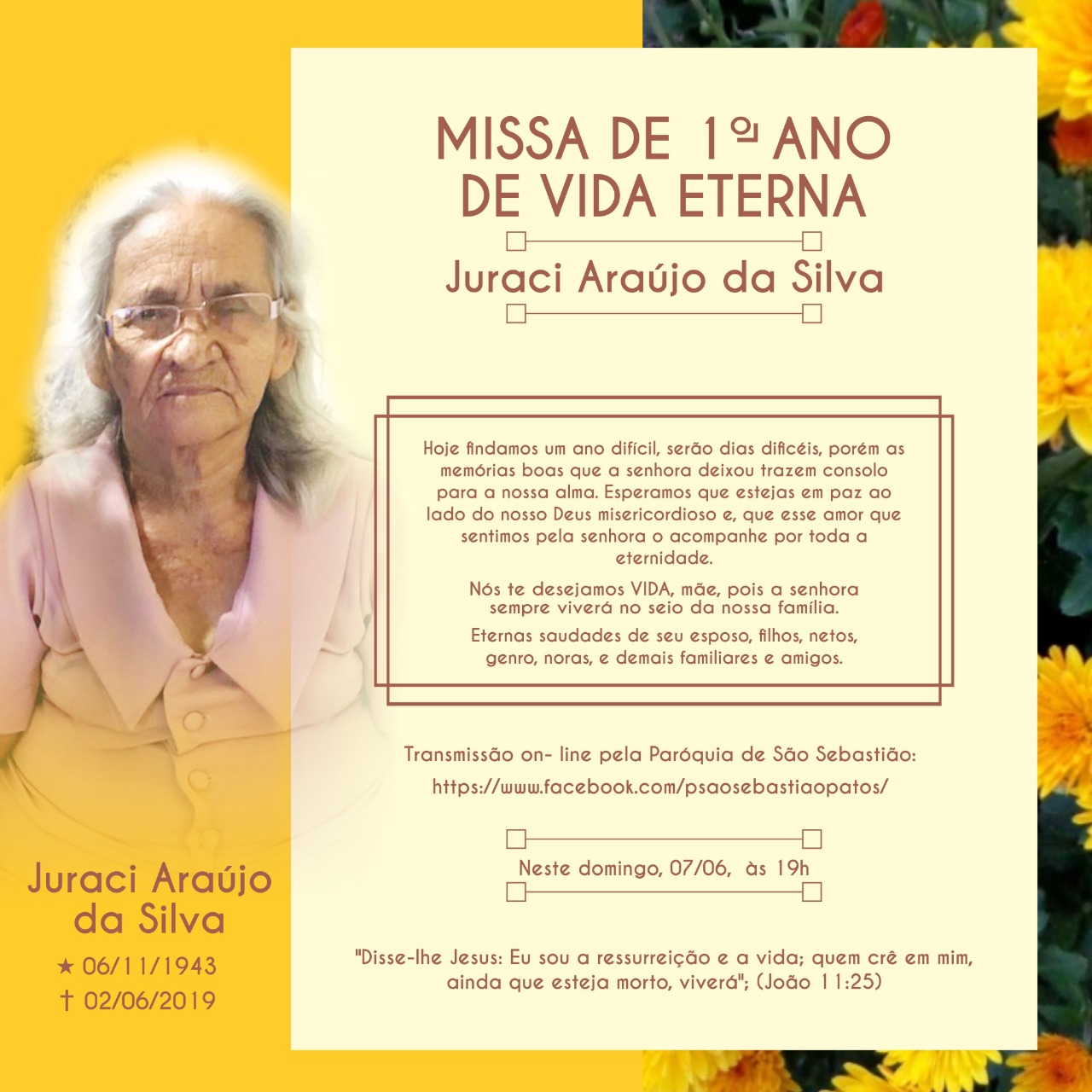A família da senhora Juraci Araújo da Silva, falecida em 02 de junho de 2019, convida todos os parentes e amigos para participarem remotamente da missa, na intenção de seu”Primeiro Ano de Vida Eterna”. A transmissão acontecerá neste domingo, 07/06, às 19h, através do link da página do facebook da Paróquia de São Sebastião- Patos, PB: https://www.facebook.com/psaosebastiaopatos/ .
